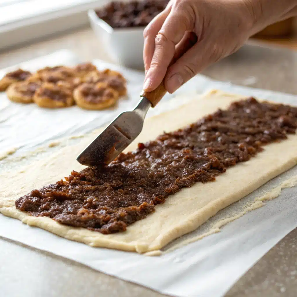 6. Spread the cinnamon filling evenly over the dough, then carefully roll it into a tight log.