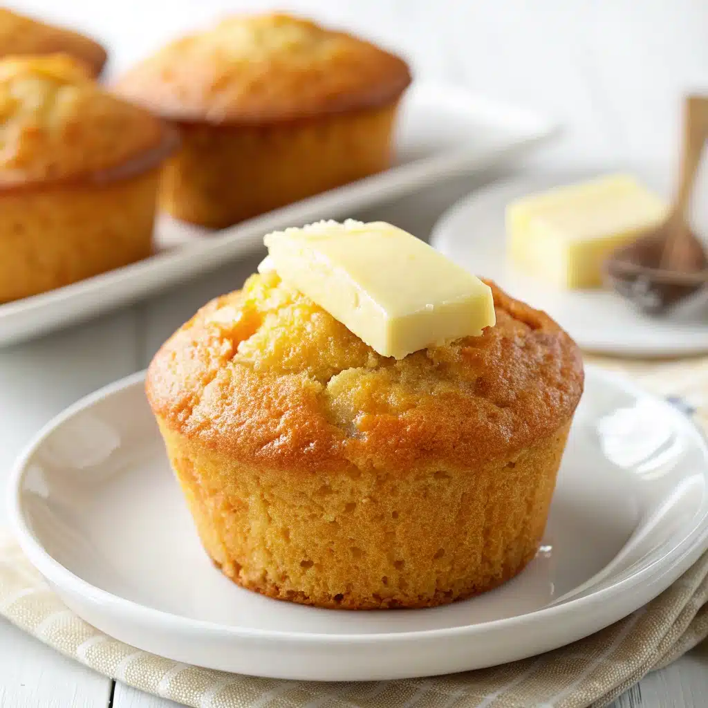 A perfectly baked Gluten-Free Corn Muffin on a white plate with a pat of butter.