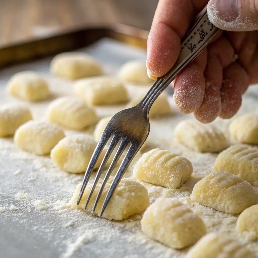 This step gives your gluten free gnocchi their classic look. Take one of the dough pillows and gently press and roll it down the tines of a fork. As you roll, use your thumb to create a small dimple on the opposite side. This creates ridges that are perfect for catching sauce. Place the finished gnocchi on a lightly floured tray or baking sheet as you go.