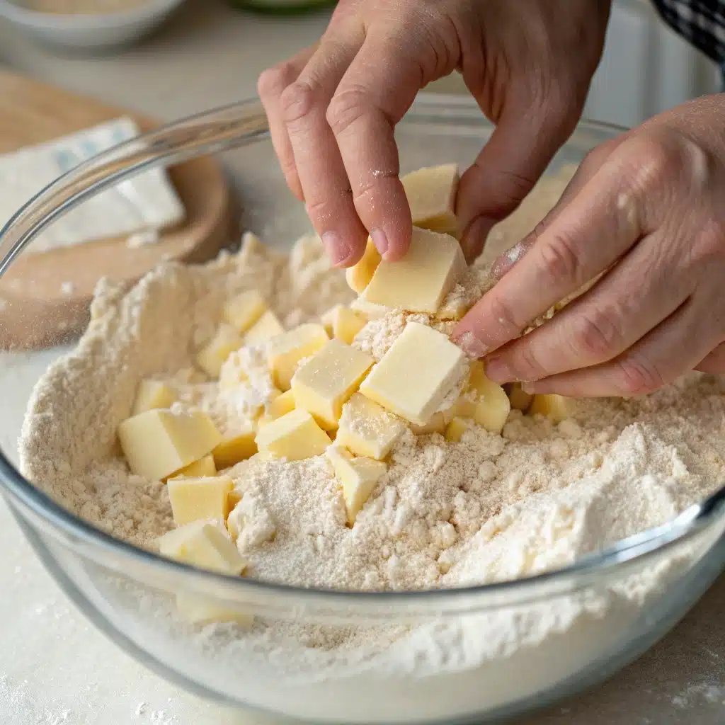 2. Add the chopped and chilled butter, and toss to coat it in the dry ingredients. Flatten each chunk of butter between your thumb and forefinger to make flat shards.